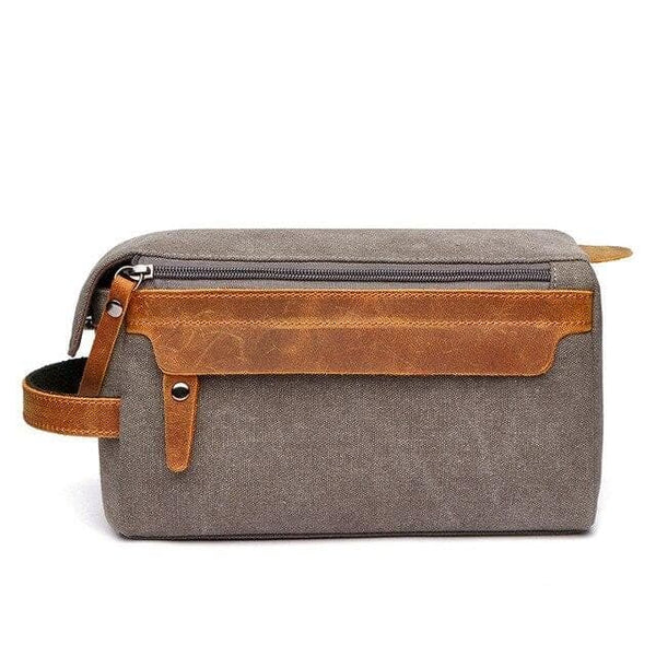 Une trousse de toilette en cuir plutôt simple avec un petit bandeau sur le devant pour lui ajouter une touche de style.